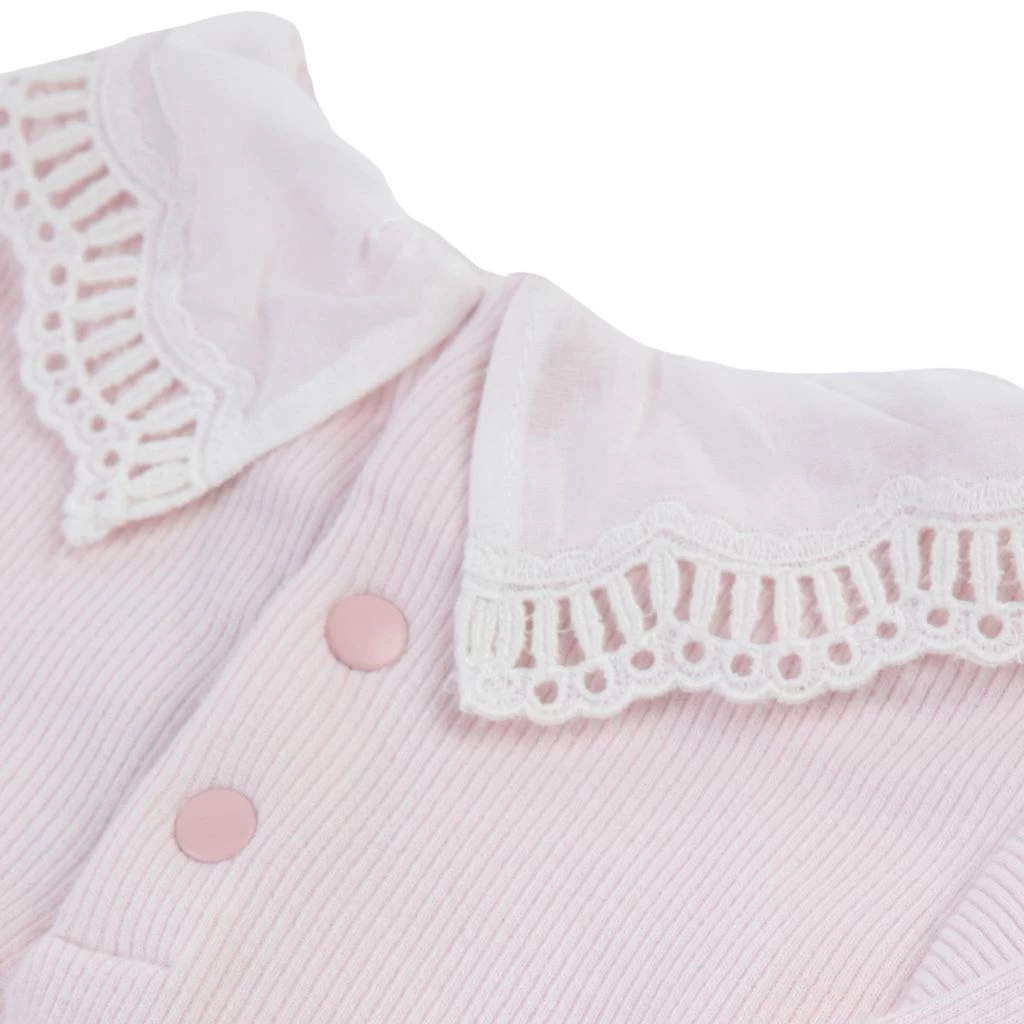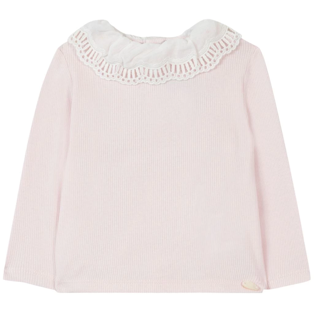 A simple, classic blouse that’s an essential piece of your wardrobe. Pink blouse by Tartine et Chocolat. The blouse has a ribbed design. It has a ruffle collar and snap buttons at the front.