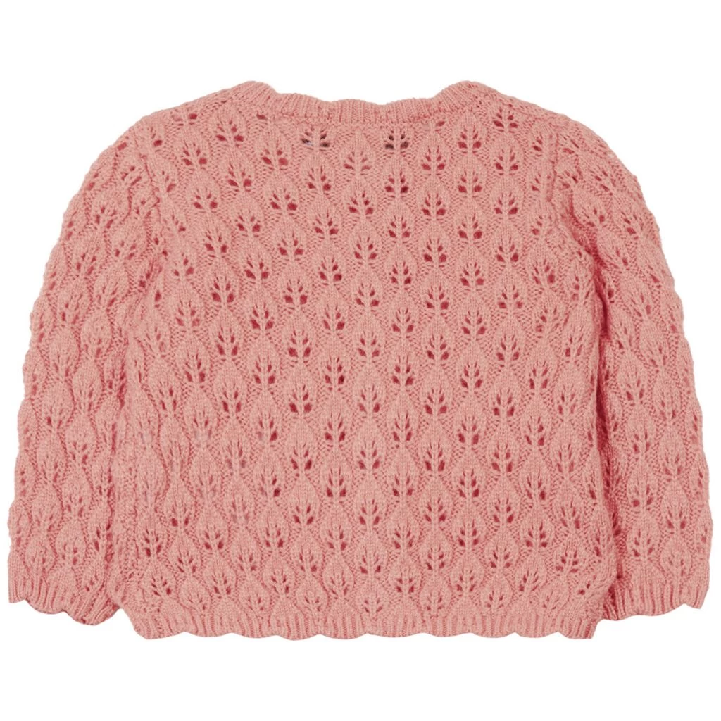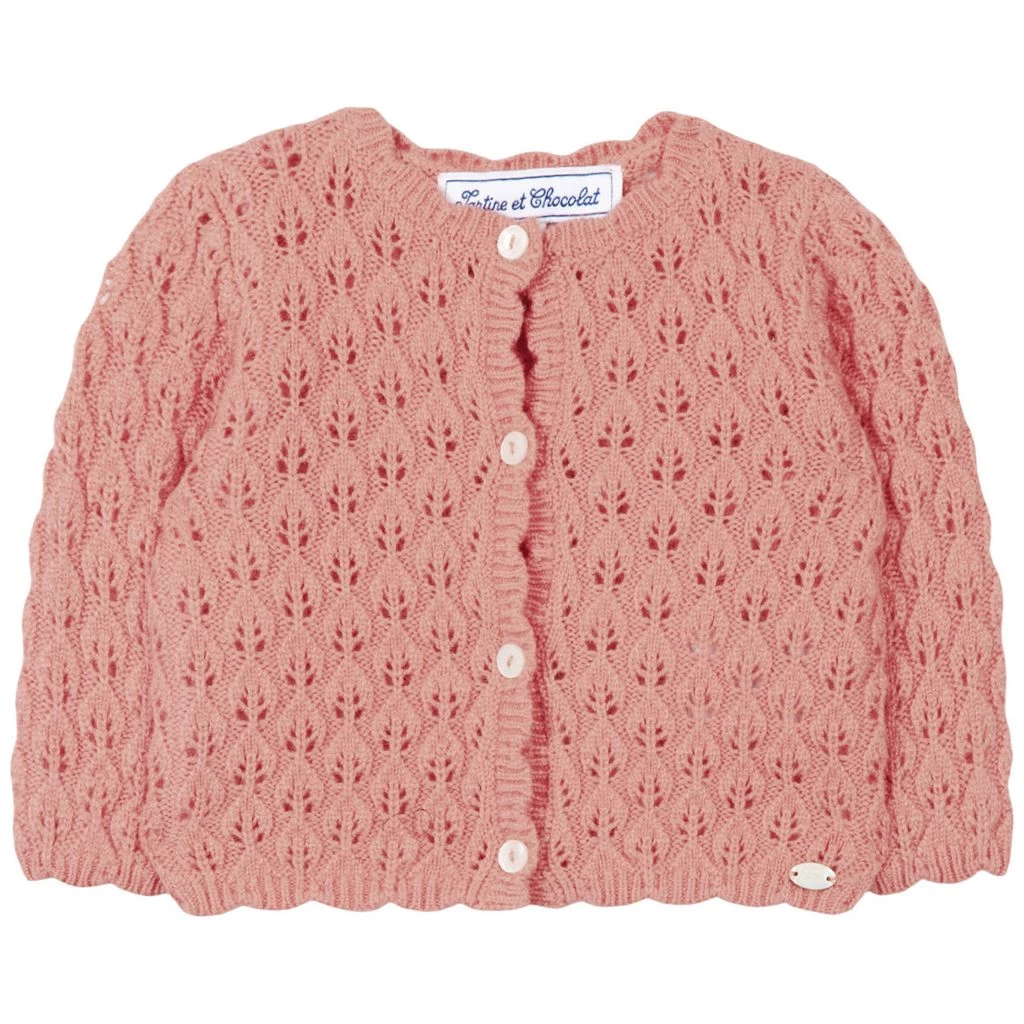 Enjoy the stylish design and soft knitted feel. Pink cardigan by Tartine et Chocolat. The cardigan has a knitted design. It has a button closure at the front.