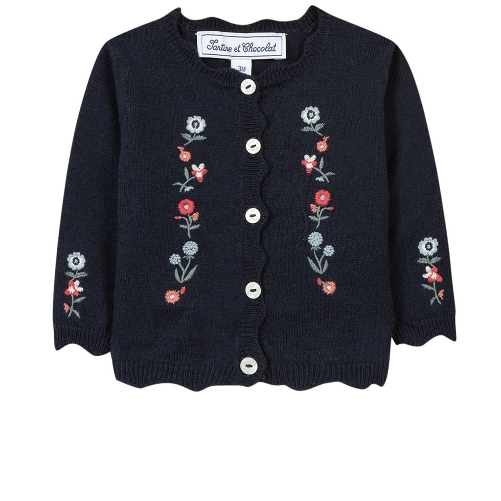 A soft cardigan with a striking new design. Navy knit cardigan by Tartine et Chocolat. The cardigan has a button closure at the front. It has flower embroidery on the front and on the sleeves and rib-knit cuffs.