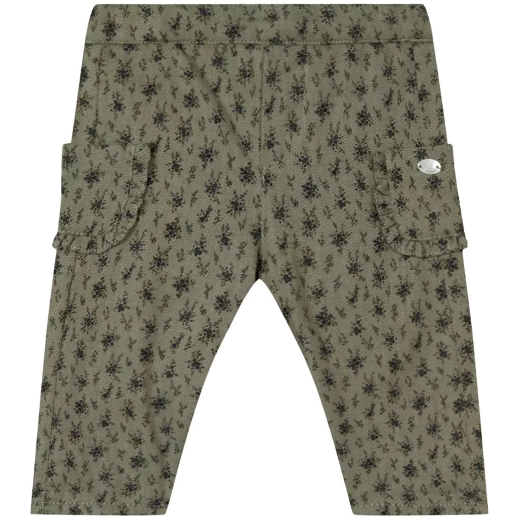 Keep little legs comfy. Green trousers by Tartine et Chocolat. The trousers have a floral all-over print. They have an elasticated waist and two front pockets.