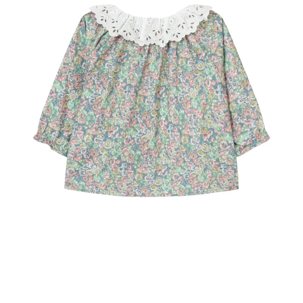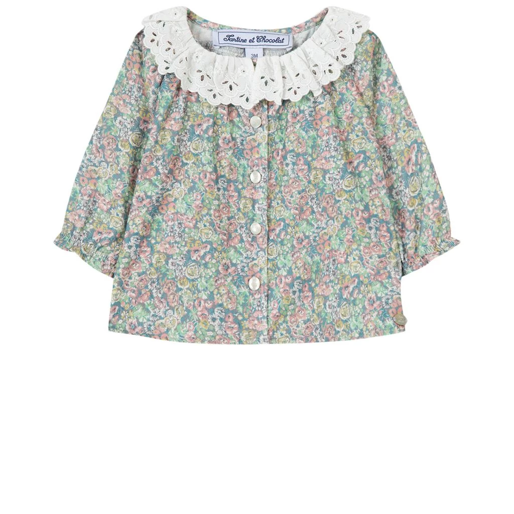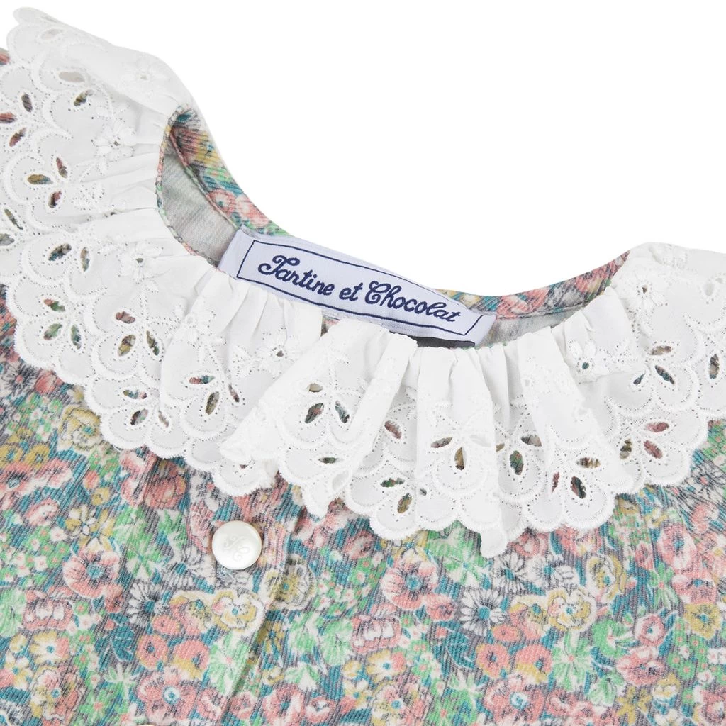 Special occasion? This is a blouse you can’t miss out on. Grey blouse by Tartine et Chocolat. The blouse has a floral all-over print. It has an embroidered ruffle collar, a button closure at the front and elasticated cuffs.