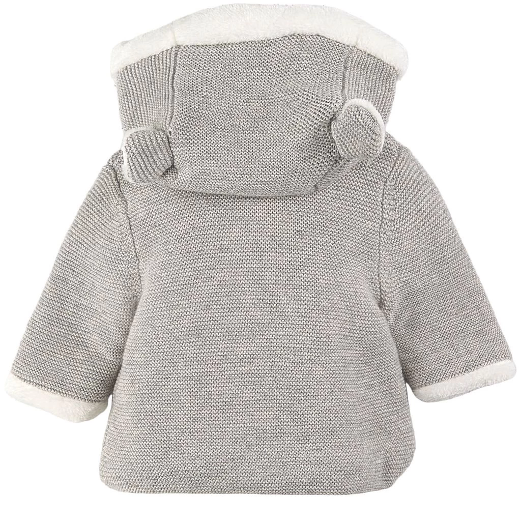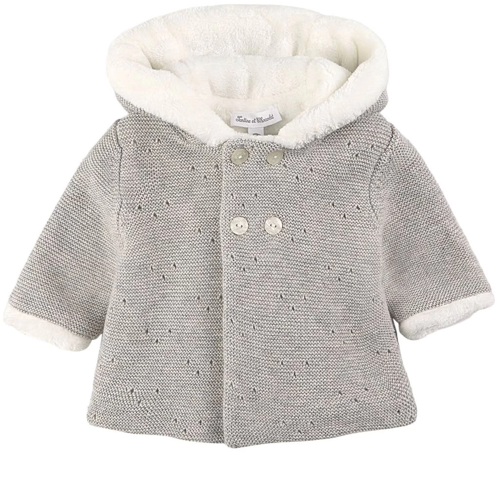 Get a cozy style. Gray knit cardigan by Tartine et Chocolat. The cardigan has a knitted design. It has cozy faux fur lining, a fixed hood and a button closure at the front.