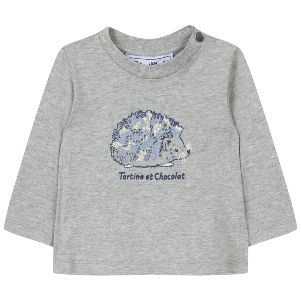 Your little one can play all day in comfort. Long sleeved, grey T-Shirt by Tartine et Chocolat. The T-Shirt has a regular fit. It has snap buttons at the shoulder and a print at the front.