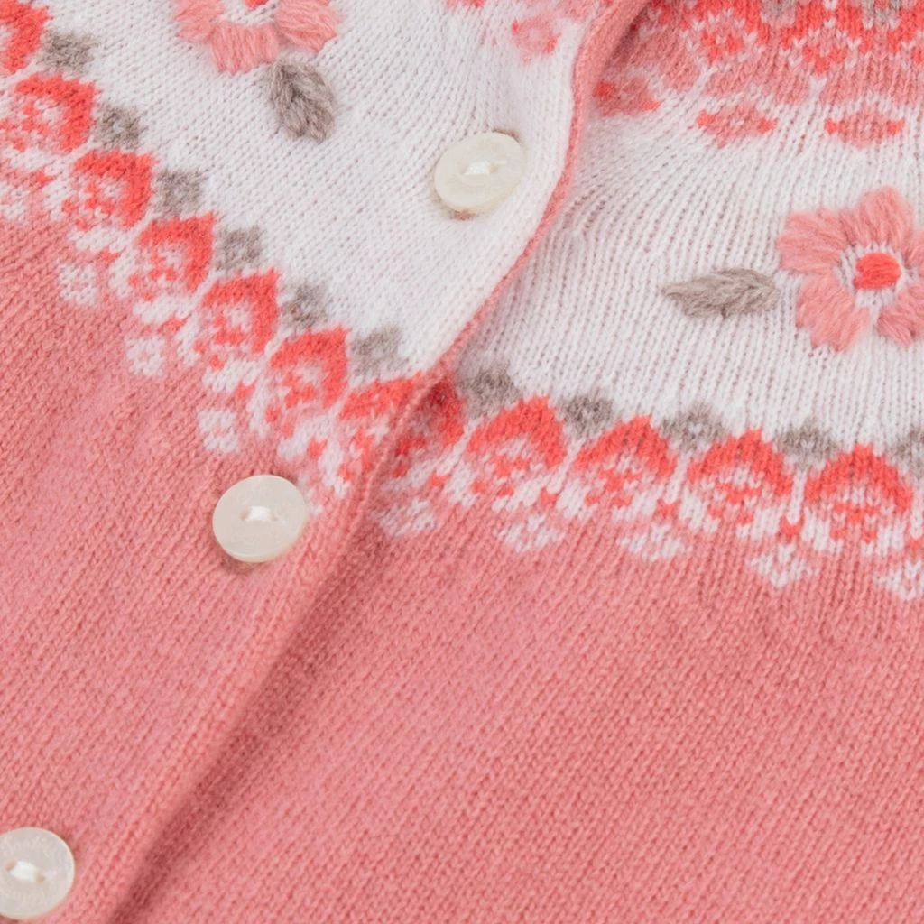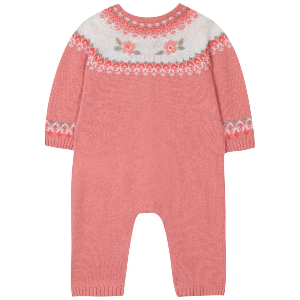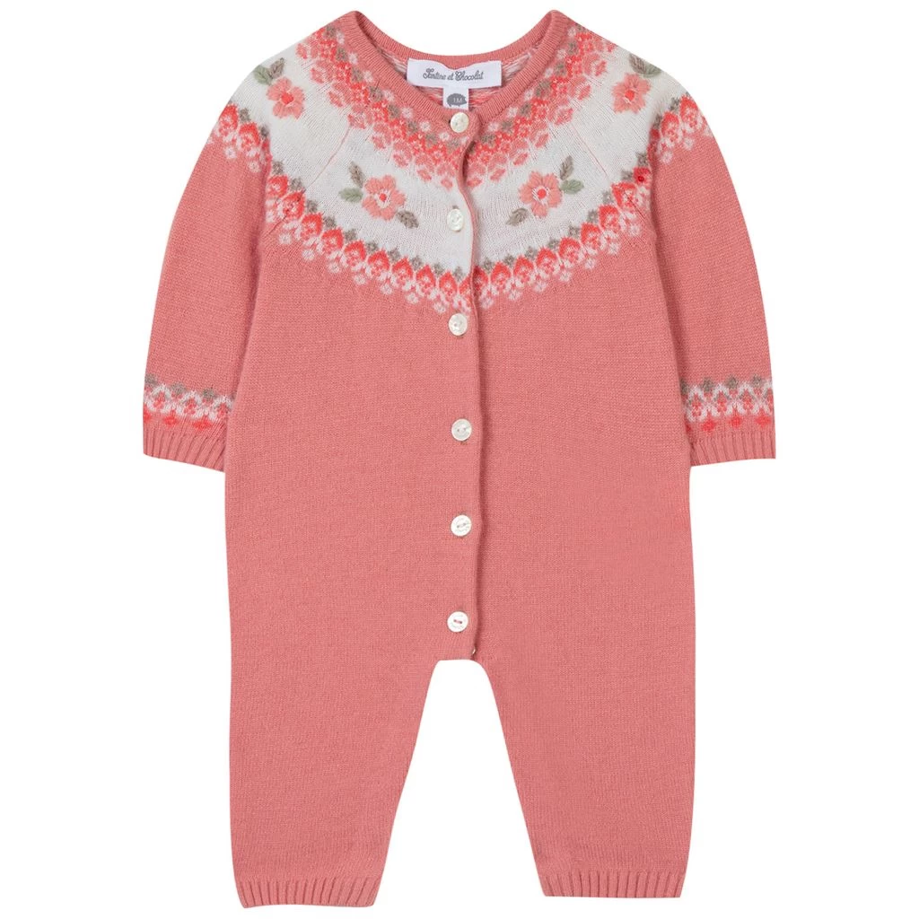 A onesie for every mood! It’s time to snuggle up. Pink, knitted onesie by Tartine et Chocolat. The onesie has a button closure at the front.