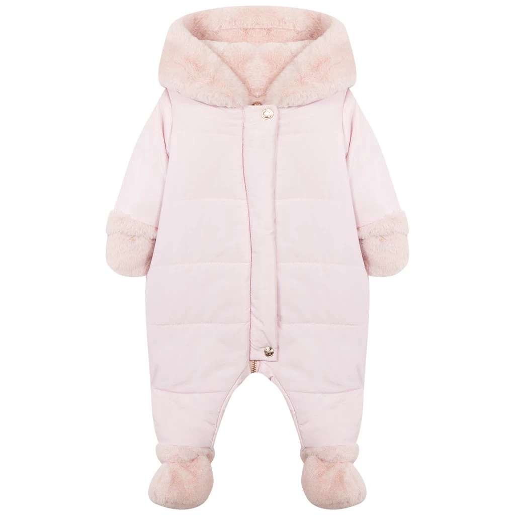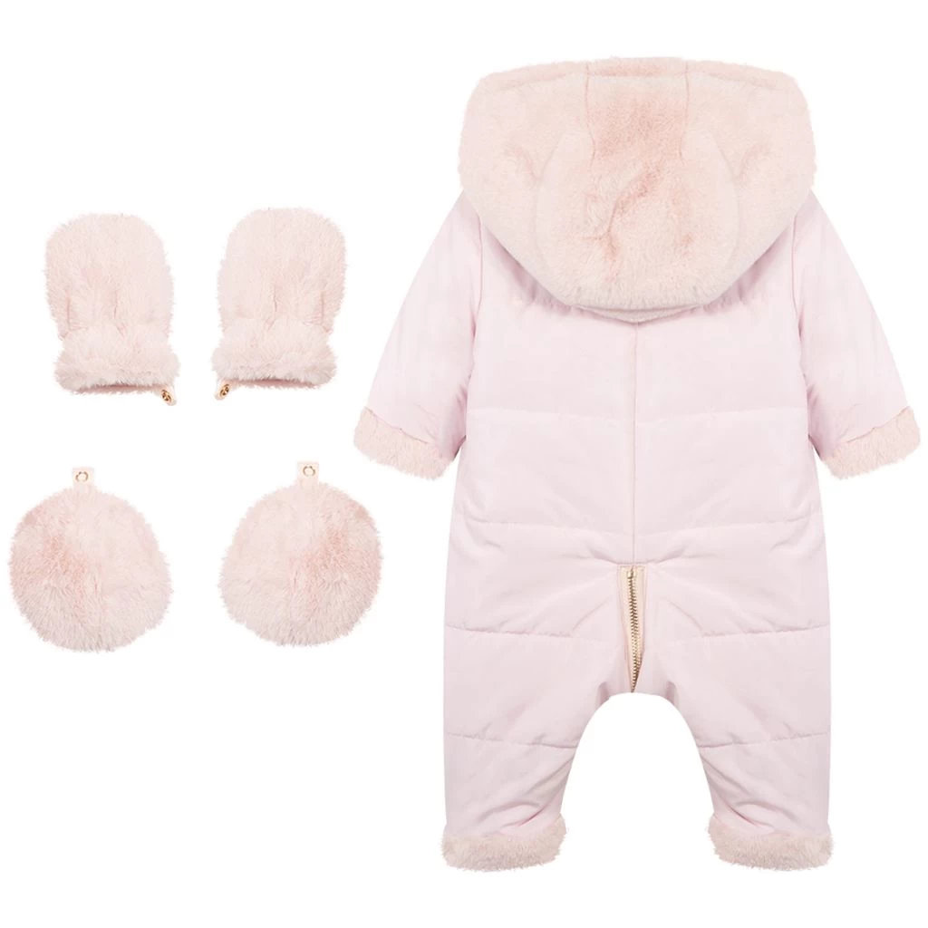 Keep your little baby warm on colder days. Rose baby coverall by Tartine et Chocolat. The baby coverall has a golden zip closure at the front. It has a reversible design, a removable feet and faux fur trims.