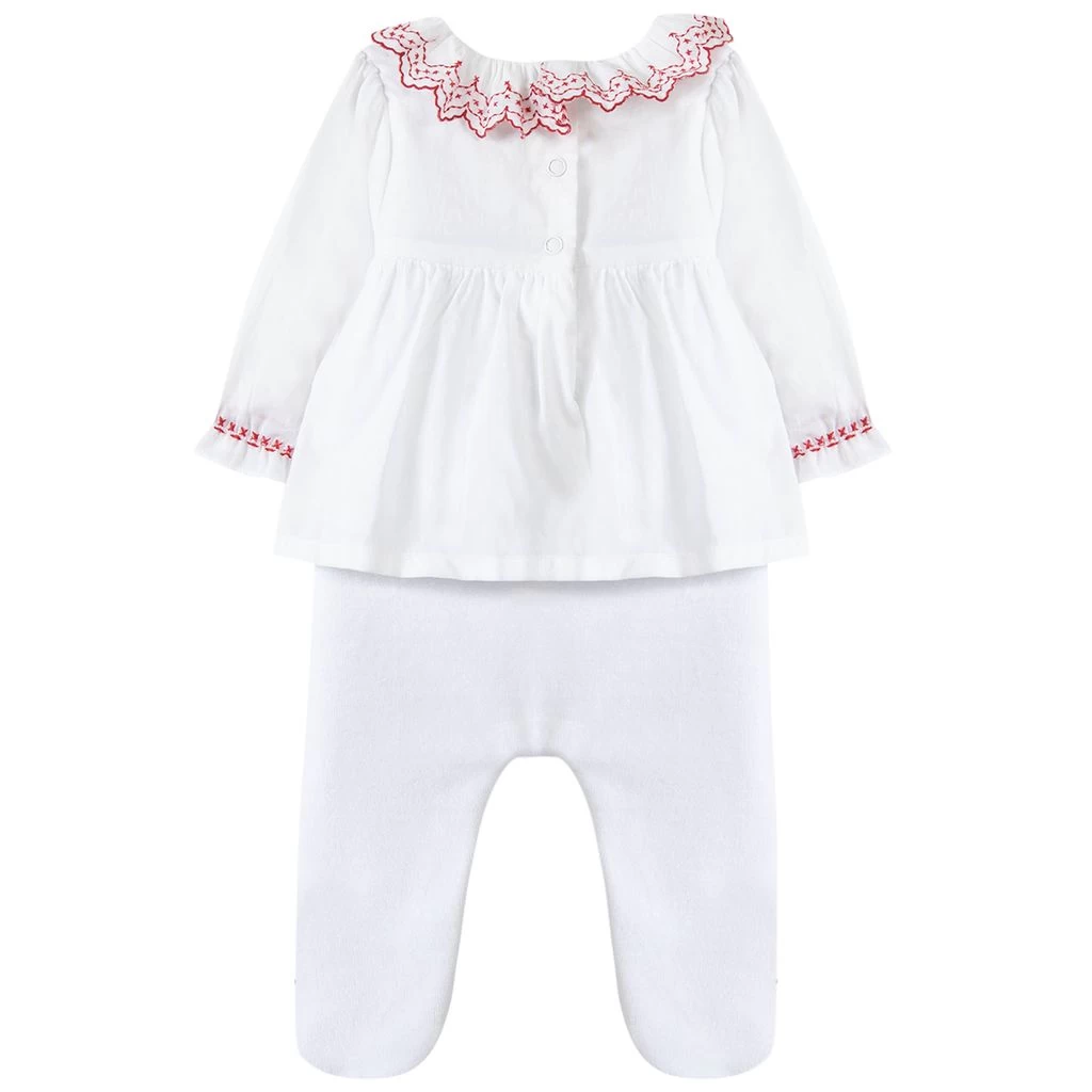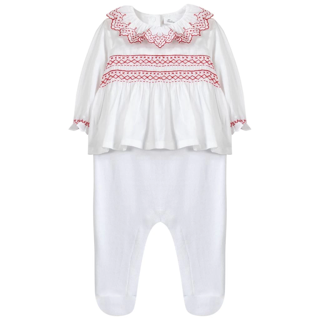 Let your baby explore and play in comfort. White baby grow by Tartine et Chocolat. The baby grow has a ruffle collar. It has a smocked bodice, snap buttons at the back and a ruffle at the waist.