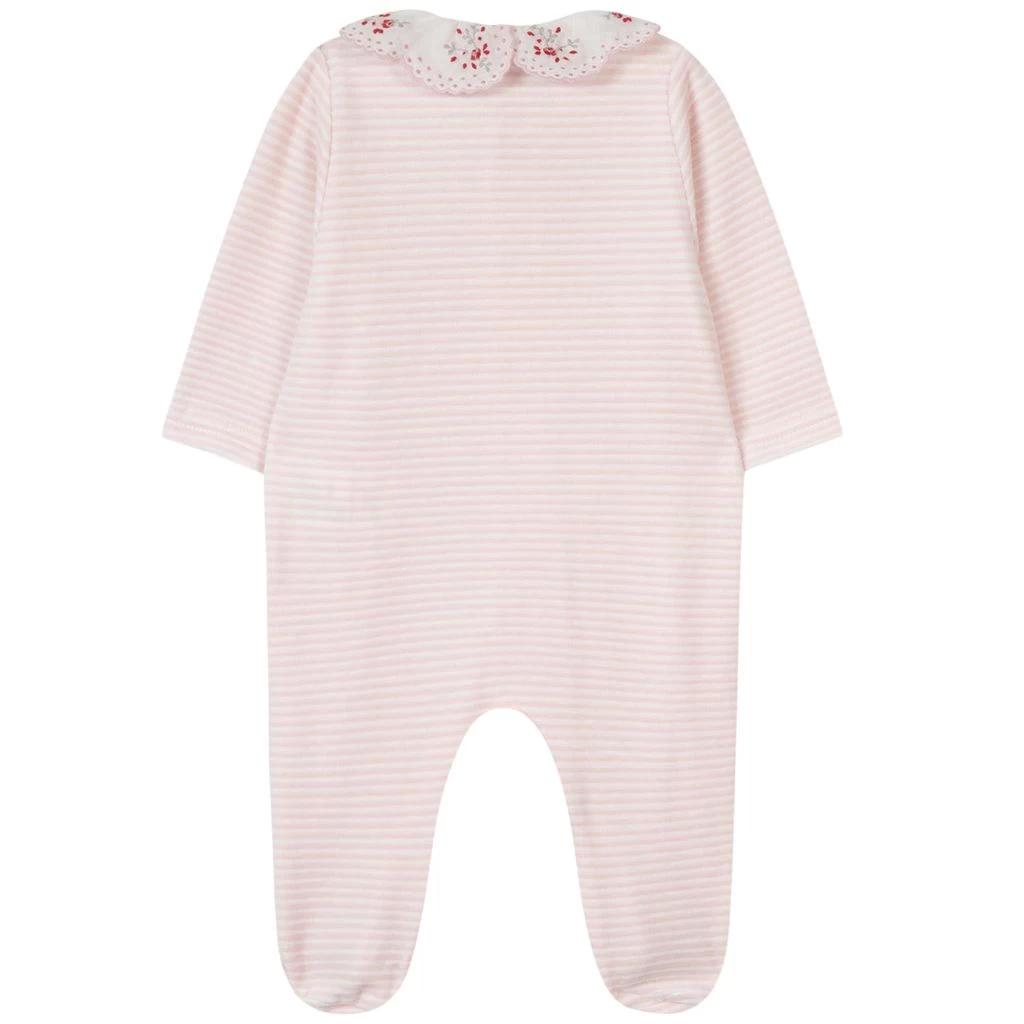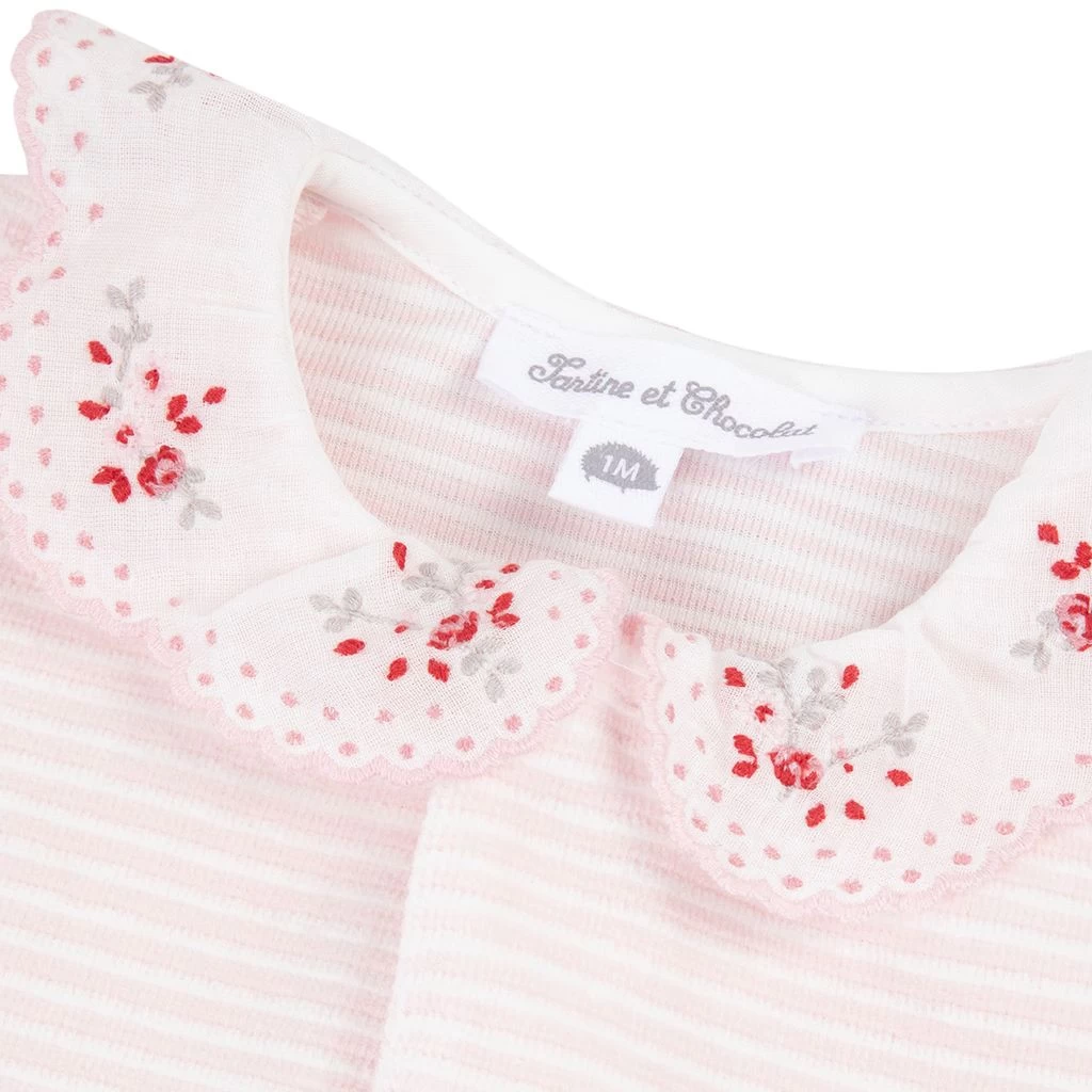 Your little one can play all day in comfort. Pink baby grow by Tartine et Chocolat. The baby grow has an embroidered ruffle collar. It has snap buttons at the front.