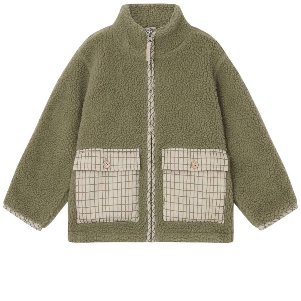 Keep warm with comfy fleece. Green fleece jacket by Garbo&Friends. The jacket has a soft teddy fleece material. It has a zip closure at the front and two front pockets.
