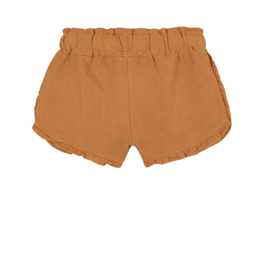 Brown Tencel shorts by My Little Cozmo. The shorts have an elasticated drawstring waist. They have ruffle trims.