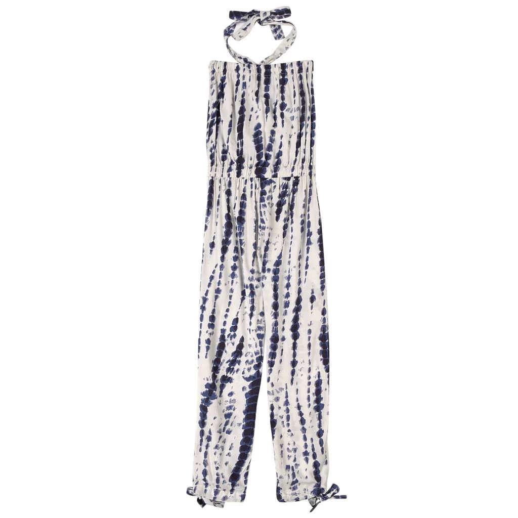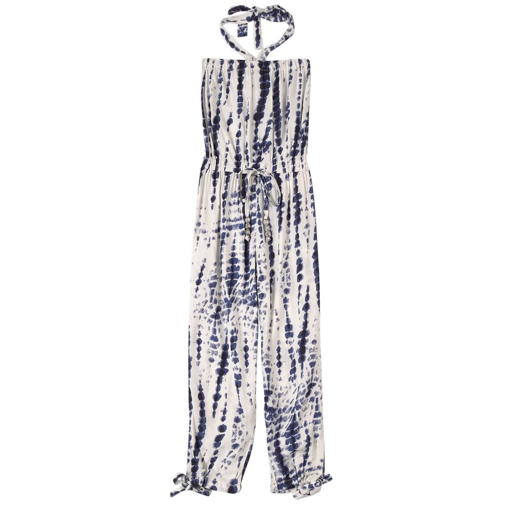 Tie Dye Moonlight jumpsuit by How To Kiss A Frog. The jumpsuit has tie straps around the neckline. It has an elasticated drawstring waist, two front pockets and bow detailing at the hem.