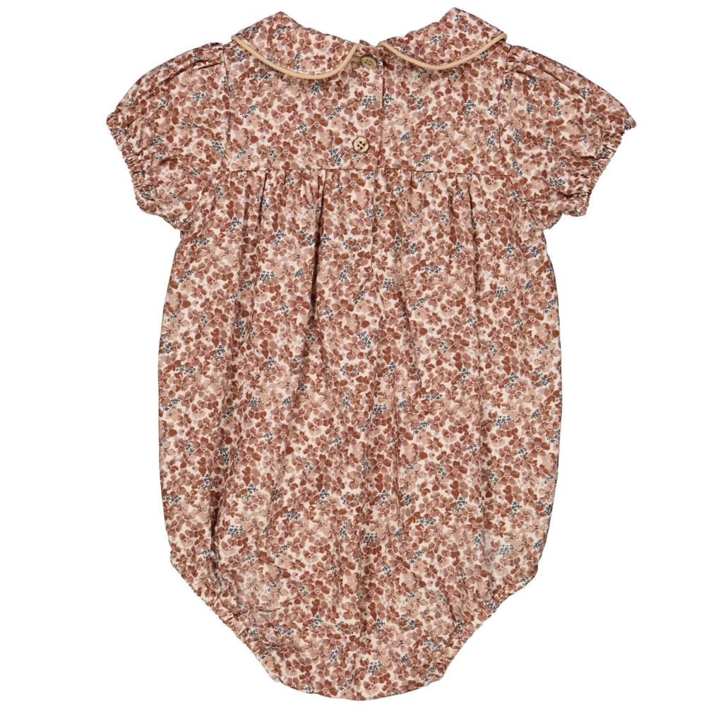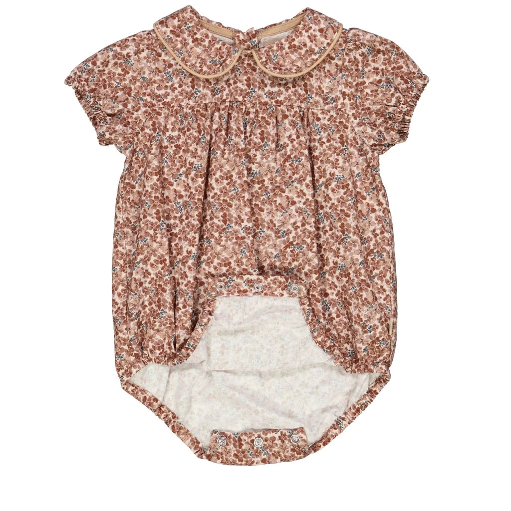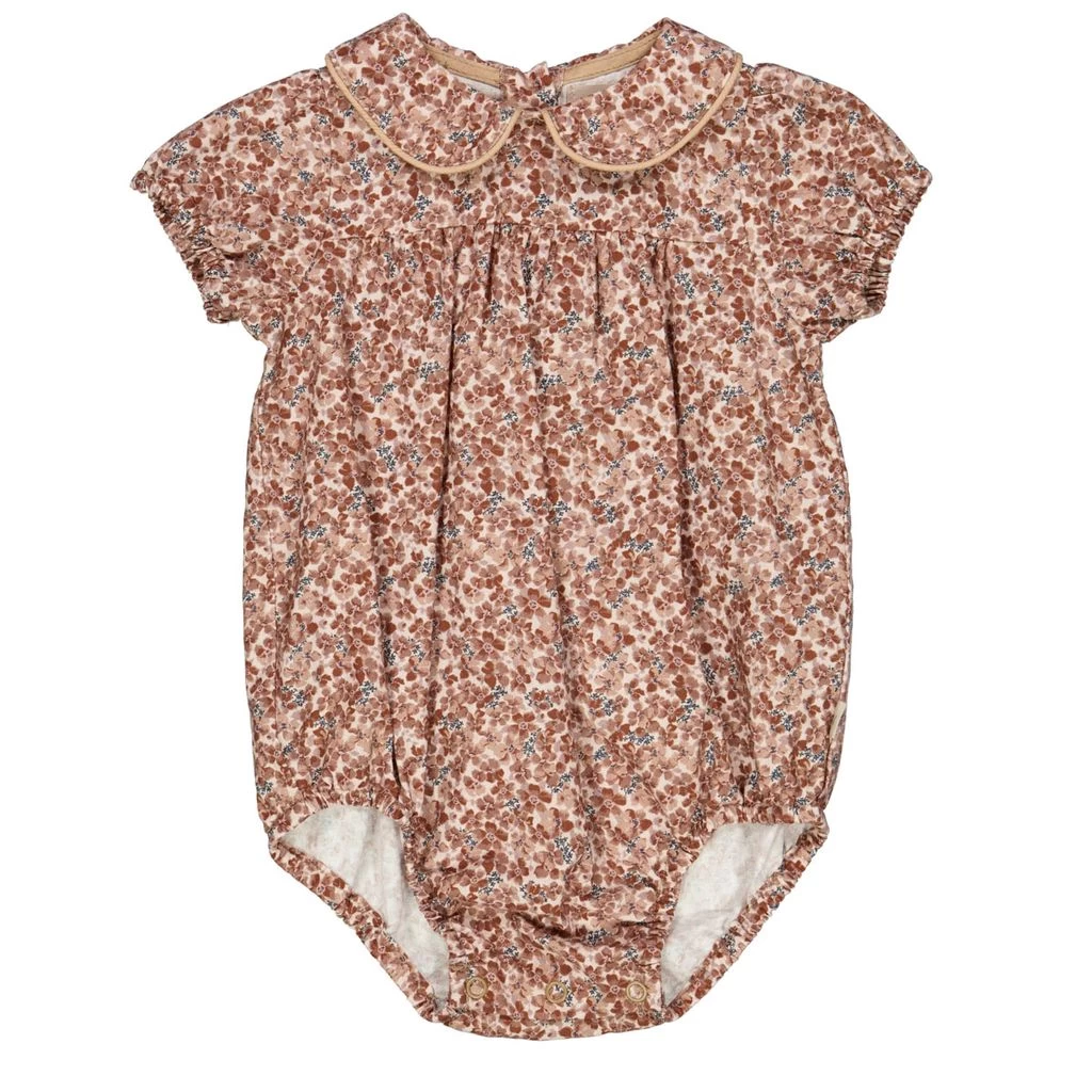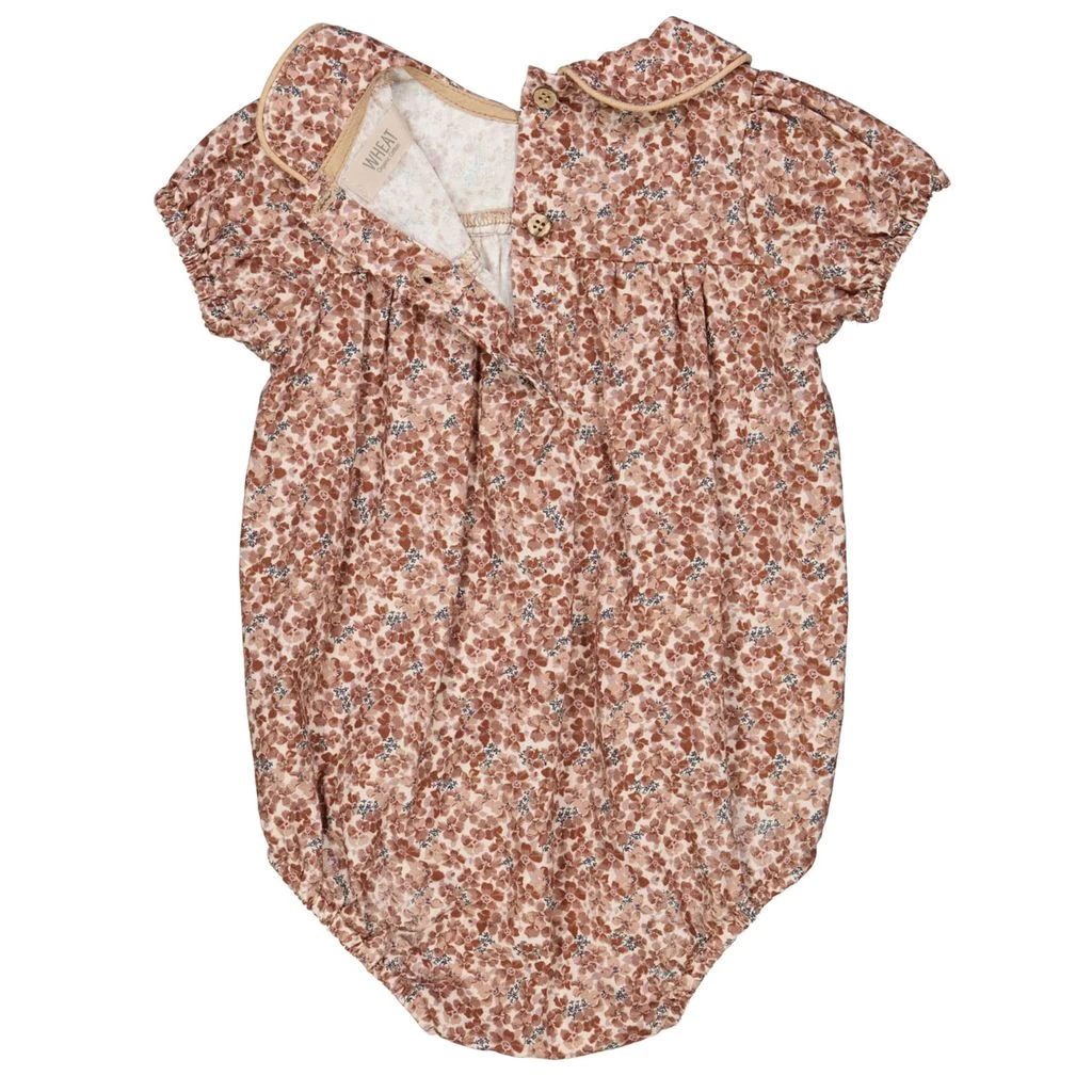 Beige Myrna baby body by Wheat. The baby body has a woven collar. It has an all-over print, a snap button closure between the legs and a button closure at the back.