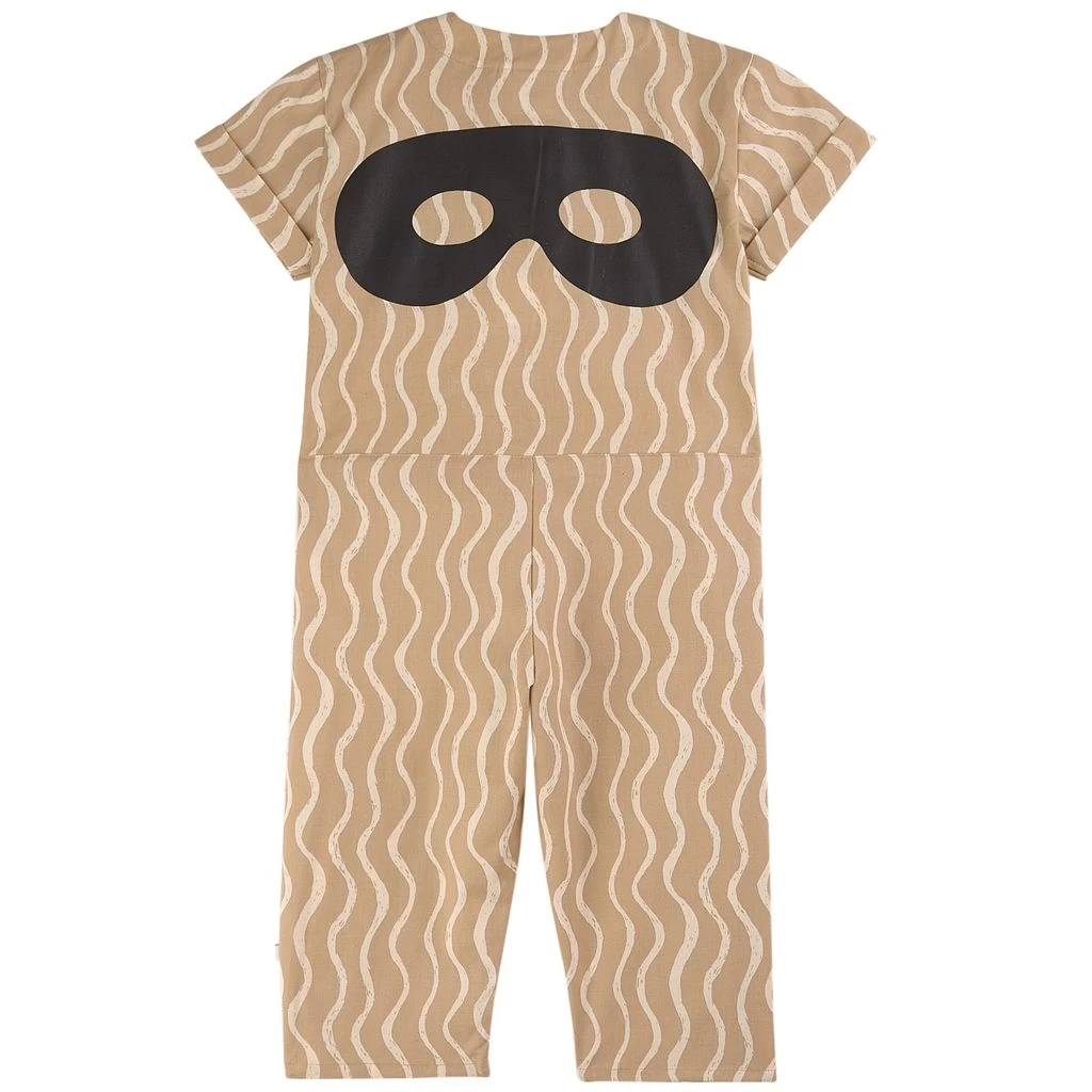 Beige Wiggle Print jumpsuit by Beau Loves. The jumpsuit has a mandarin collar. It has a button closure at the front and two front pockets.